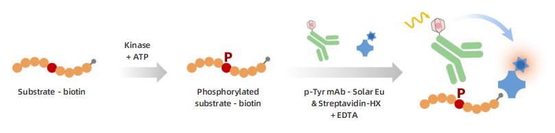 本试剂盒是运用KeyTec® TR-FRET技术开发的夹心型免疫分析方法,具有简单快速、特异性高、灵敏度高、重复性好等特点。基本步骤和原理如下图(图1)所示。第一步,酶反应阶段:在含有待测激酶和ATP的酶反应缓冲体系中,激酶将特异性底物磷酸化。第二步,检测阶段:加入含有EDTA(终止酶反应)的特异性抗体与Streptavidin - HX即可检测磷酸化底物的水平。特异性识别磷酸化位点的抗体与磷酸化的底物结合、Streptavidin - HX与底物末端的生物素结合之后,从而使TR-FRET供体与受体相互靠近,在外部光源的激发下发生能量共振转移,产生TR-FRET信号;TR-FRET信号强度与磷酸化底物的量成正比。
