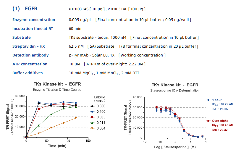 KeyTec® TR-FRET Revamped TKs kinase检测试剂盒可检测激酶相对活性水平。试剂盒中使用一种酪氨酸激酶通用底物和一组通用检测试剂来测定激酶的相对活性。本试剂盒也可搭配药科元优化设计的多种酪氨酸特异性底物使用。酪氨酸激酶(Tyrosine kinases, TKs)家族成员众多,本试剂盒可兼容60种以上酪氨酸激酶的活性测定(数据持续更新中,详情访问官网或咨询客服)。本试剂盒中使用了经过优化设计的生物素偶联多肽作为底物,可与KeyTec® TR-FRET HX*1偶联的链霉亲和素(Streptavidin - HX)结合;配合偶联了KeyTec® TR-FRET Solar Eu*2的抗phospho-Tyr特异性抗体一起使用,即可通过检测被磷酸化底物的水平来评估相对酶活或抑制剂性能。