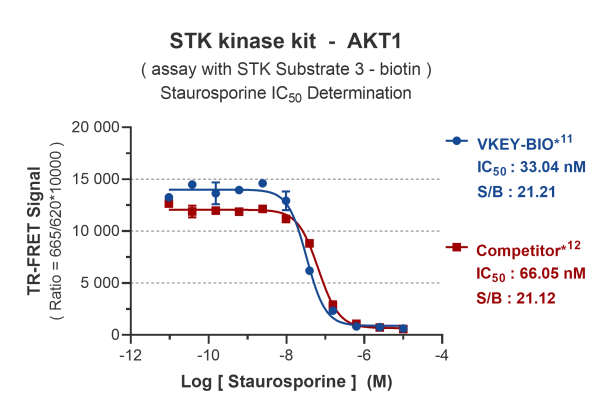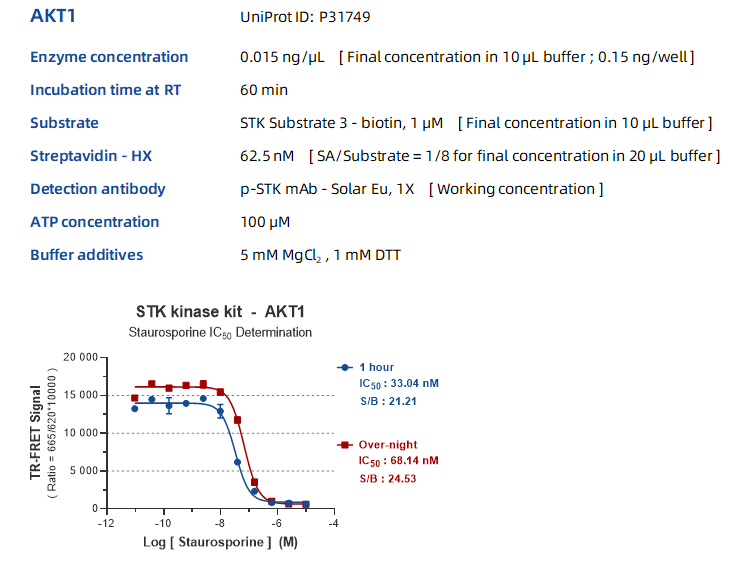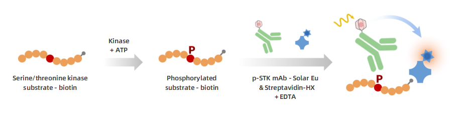KeyTec® TR-FRET STK S3 kinase检测试剂盒可检测激酶相对活性水平。试剂盒中使用1种丝氨酸/苏氨酸激酶底物和一组通用检测试剂来测定激酶的相对活性。丝氨酸/苏氨酸激酶(Serine/threonine kinase, STK)家族成员众多,本试剂盒可兼容50种以上丝氨酸/苏氨酸激酶的活性测定。本试剂盒中使用了经过优化设计的生物素偶联多肽作为底物,可与KeyTec® TR-FRET HX*1偶联的链霉亲和素(Streptavidin - HX)结合;配合偶联了KeyTec® TR-FRET Solar Eu*2的phospho-STK*3 特异性抗体一起使用,即可通过检测被磷酸化底物的水平来评估酶的活性。